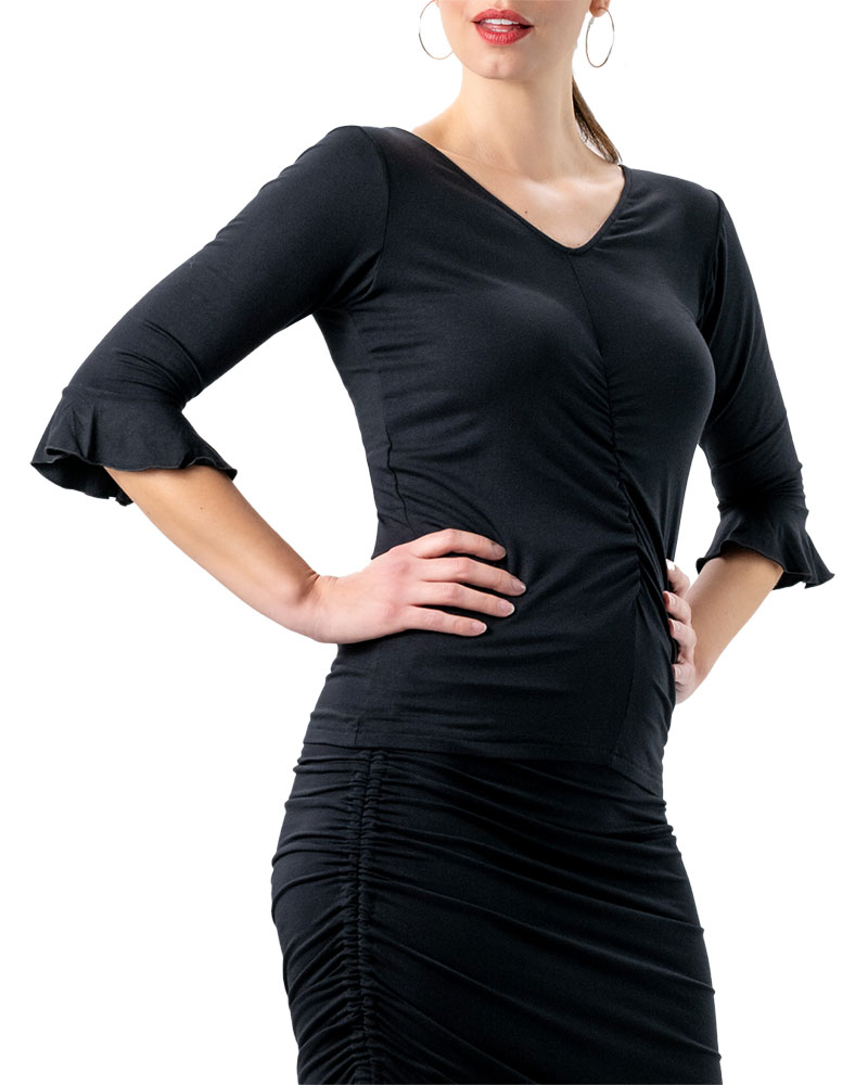 Damen Tanzoberteil Talvi in Schwarz mit V-Ausschnitt und Volantärmeln – für Salsa, Tango und Co. Das Tanzoberteil Talvi in elegantem Schwarz aus superweichem Bambus-Elastan-Mix bietet höchsten Tragekomfort. Es begeistert mit einem klassischen V-Ausschnitt und einer dekorativen Raffung im Vorderteil. Die ¾-Ärmel sind mit dezenten Volants verziert und die vordere Mitte ist optisch leicht gerafft. Das schwarze Tanzoberteil schmiegt sich angenehm an und bietet optimale Bewegungsfreiheit. Ideal dazu: unser Tanzrock Liya aus dem gleichen Material – ein perfektes Match auf der Tanzfläche - egal ob bei Tango, Standard, Bachata oder Salsa.